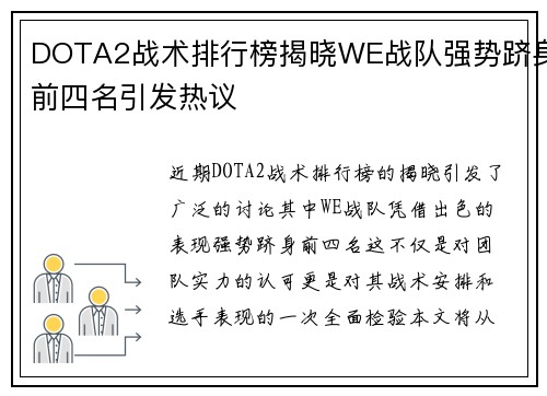 DOTA2战术排行榜揭晓WE战队强势跻身前四名引发热议