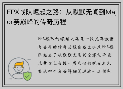 FPX战队崛起之路:从默默无闻到Major赛巅峰的传奇历程