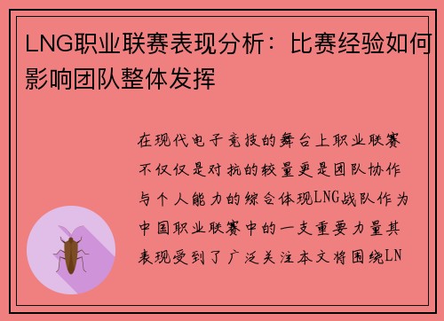 LNG职业联赛表现分析:比赛经验如何影响团队整体发挥