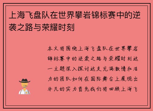 上海飞盘队在世界攀岩锦标赛中的逆袭之路与荣耀时刻